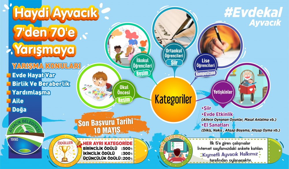 18- Belediye Bünyesinde “ Haydi Ayvacık 7’den 70’e Yarışmaya ” Okul Öncesi, İlkokul, Ortaokul, Lise ve Yetişkinler Arası Ödüllü Yetenek Yarışması ile İçinde bulunulan pandemi dönemini “Evde Hayat Var” sloganı ile fırsata çevirerek evde çocukların ve yetişkinlerin eğlenceli zaman geçirmelerini sağladık.